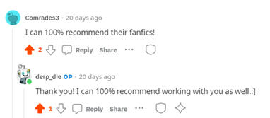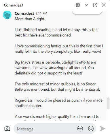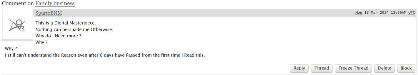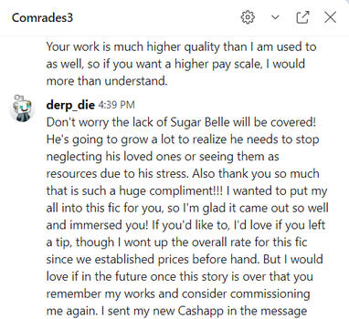 Commenter SpurtoBNM on AO3 under my fic 'Family Business' (This fic is a NSFW commission only found on my NSFW account).